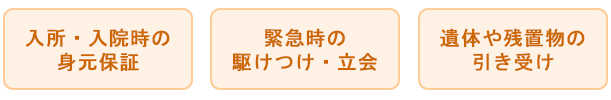 など、様々な事情でお困りの方のために、身元保証人の請負サービスを行っております。 身元保証人として契約書等にサインするだけでなく、老人ホームや病院との連絡や各種お手続き・支払い、万一の際の駆け付け・立会い、遺体や残置物の処理まで、すべてお引き受けいたしますので、安心して住まいの選択を行えます。 |